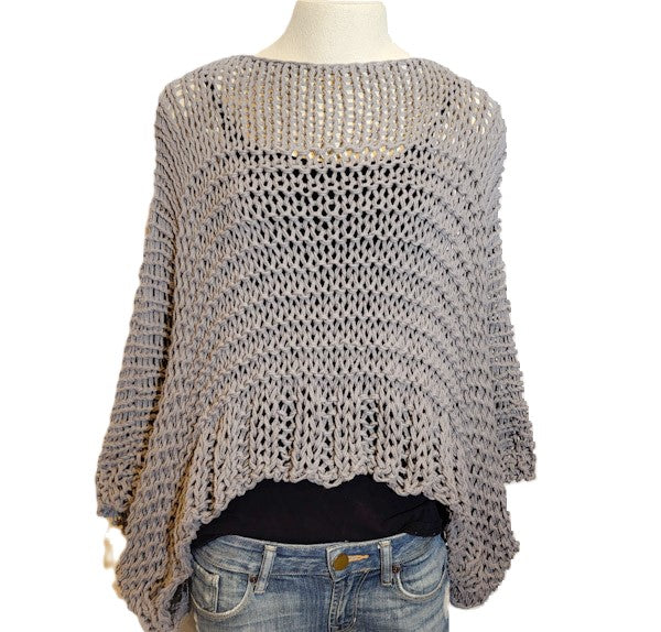 Cosy cotton oversized sweater. Hand knit in 100% cotton. Easy to wear over jeans or skirts. The sleeves are open. Perfect as a top for warm or cool days. Wear over a tank, tee or long sleeve shirt. The BOHO is very versatile.