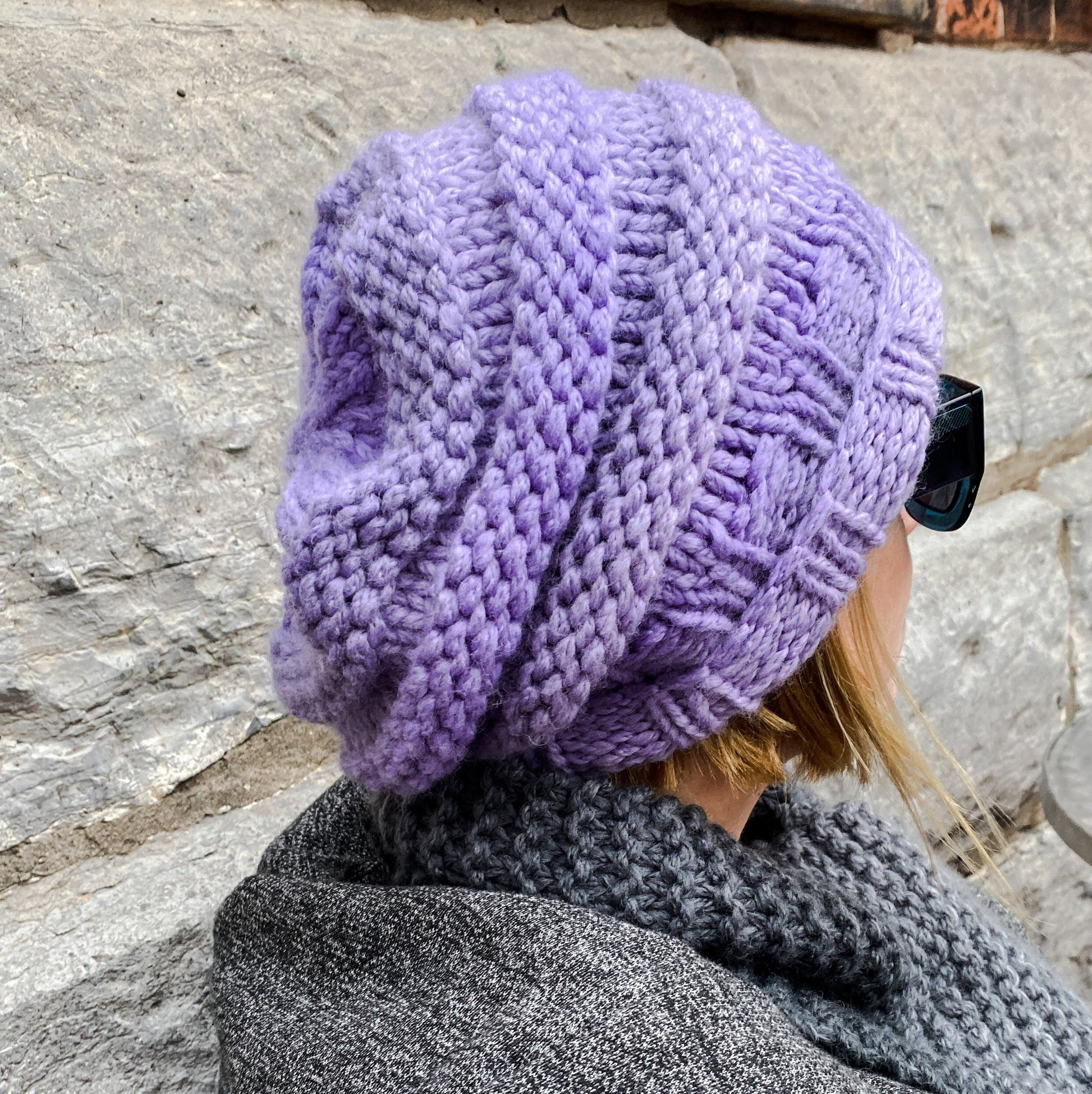 My hand knit Super Slouchy Chunky Hat keeps you warm And looks great!